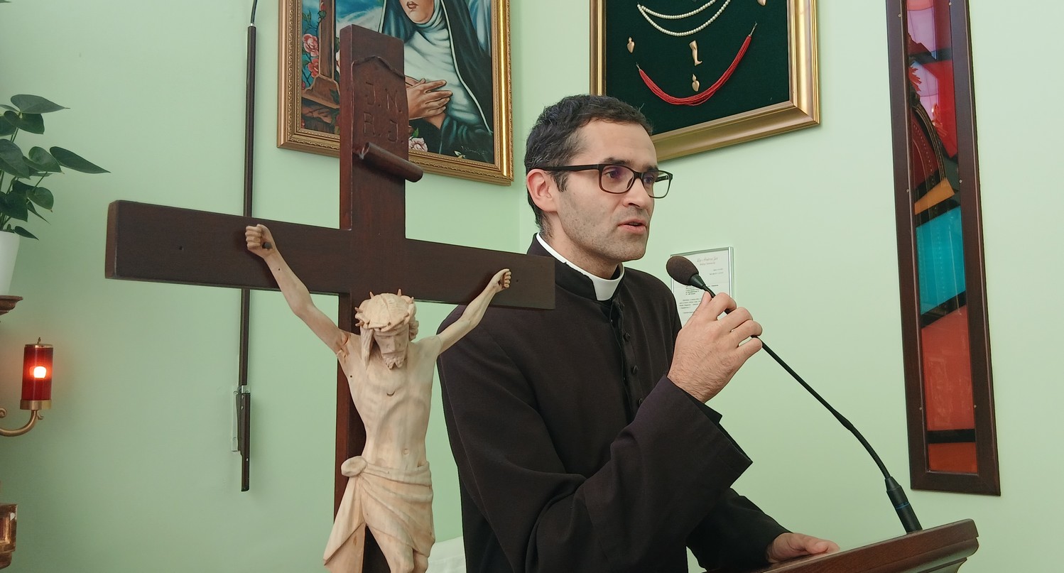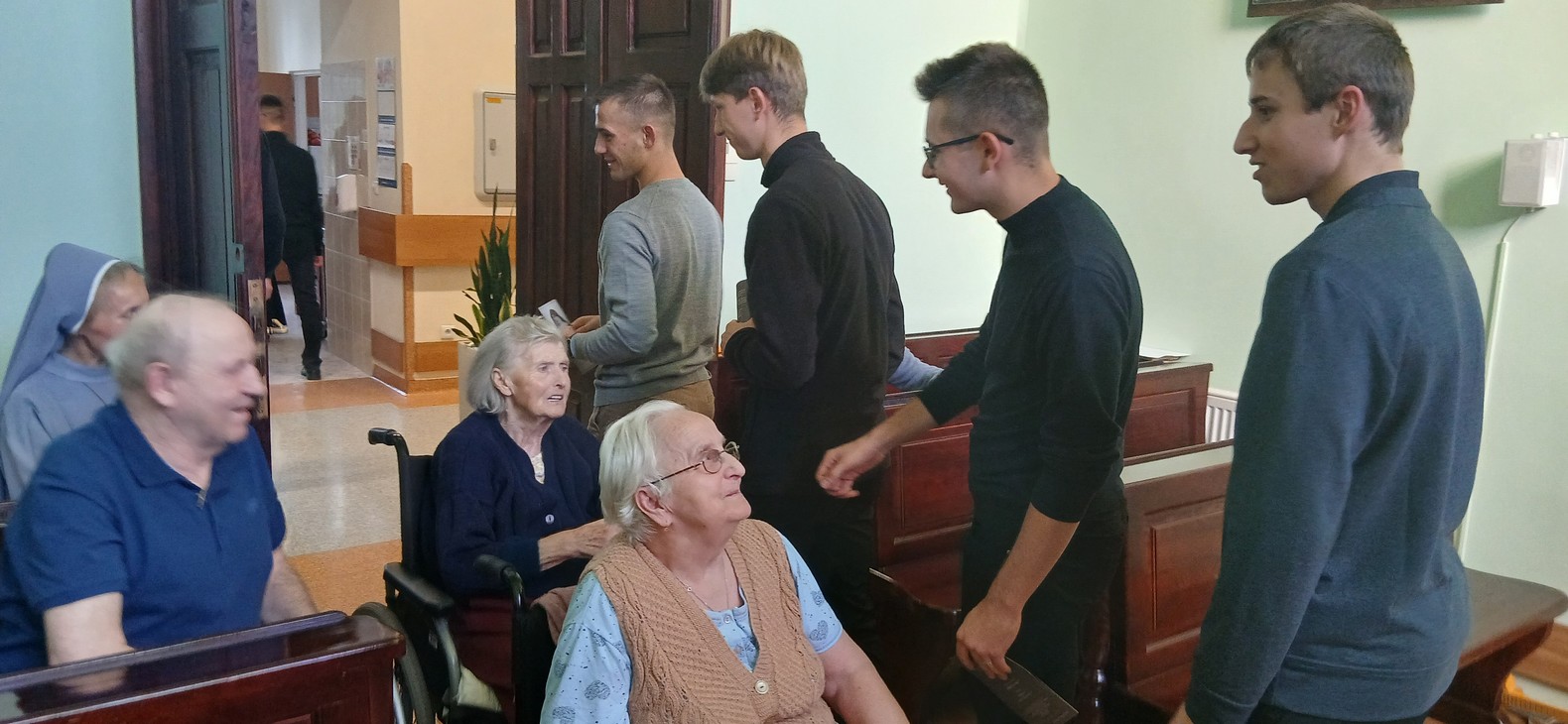 W niedzielę 26 października przeżywaliśmy radosną wizytę Gości z Wyższego Seminarium Duchownego w Tarnowie. W kaplicy, podczas spotkania mieszkańców naszego domu z alumnami, ojciec duchowny ks. Paweł Hopej podzielił się swoim świadectwem. Powiedział on, że jest związany z naszym domem, gdyż kiedy był klerykiem systematycznie przychodził tutaj z odwiedzinami w każdą lub co drugą niedzielę i co roku w czasie Wielkiego Tygodniu posługiwał w kaplicy oraz śpiewał m.in. Pasję. Ks. Paweł mówił, że być może jeszcze najstarsze osoby go pamiętają. "Zawsze radosna była mi taka niedziela z chorymi. Pamiętam, że kiedy nieraz było ciężko, trudno, coś tam w sercu człowiek przeżywał, stresował się to zawsze tutaj ten pobyt z Wami tak działał kojąco i dawaliście mi zawsze dużo radości. Dlatego też myślę, że tak będzie i tym razem kiedy tutaj będziemy przychodzić".