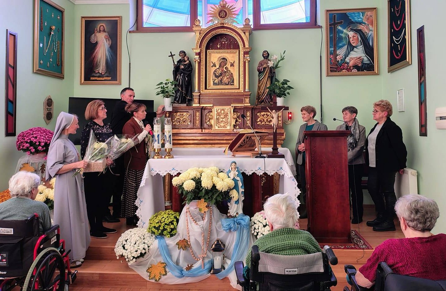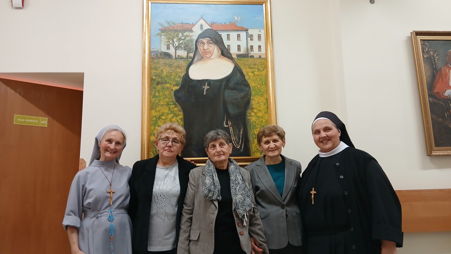 W czwartek i piątek (6 i 7 listopada) gościliśmy w naszym domu rodzinę s. Kolumby Czarnota, która przyjechała do nas z okolic Poznania. Były to wnuczki dziadka s. Kolumby panie Maria i Anna oraz ich bratowa Urszula. Dla pracowników i mieszkańców naszego domu było to niezwykłe przeżycie. Panie opowiadały nam historię swoich bliskich i przywiozły zdjęcia s. Kolumby i rodziny. Szczególnie piękną jest fotografia z jubileuszu 50-lecia ślubów zakonnych s. Kolumby w Kluczborku. Przedstawia ona S. Kolumbę i drugą siostrę jubilatkę z wiankami na głowie i krzyżami udekorowanymi kwiatami w otoczeniu wielu sióstr i dwóch kapłanów. S. Kolumba spogląda z zadumą i spokojem w dal, chciałoby się powiedzieć dalej, niż widzi nasz wzrok. To zdjęcie ukazuje życie poświęcone bez reszty Bogu i bliźnim, szczególnie ubogim i chorym.